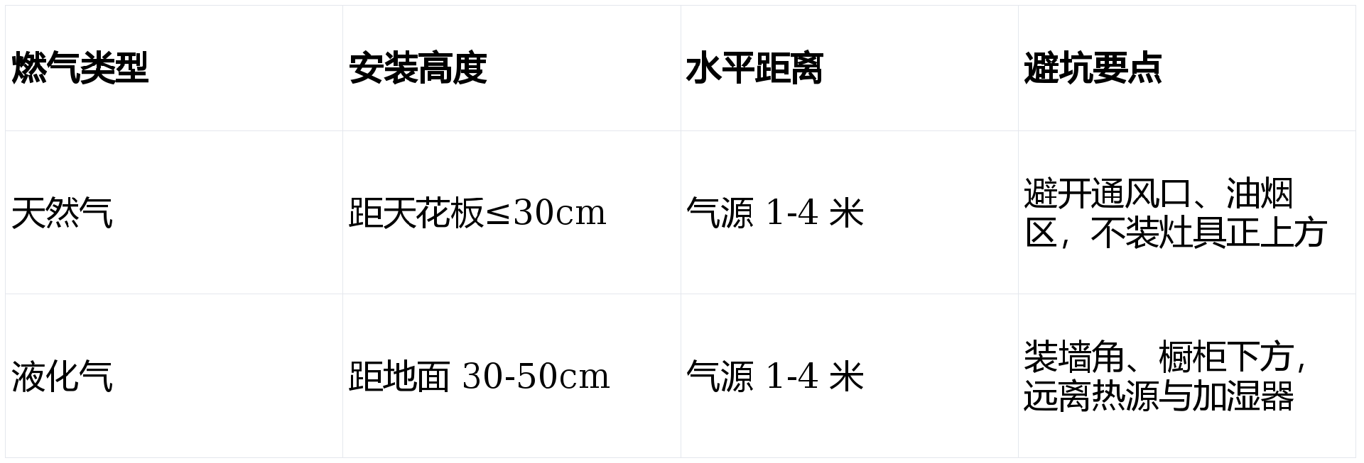 夜化气(丙烷 / 丁烷,重于冷空气):选丙烷上用型,避开专用型误报漏报。